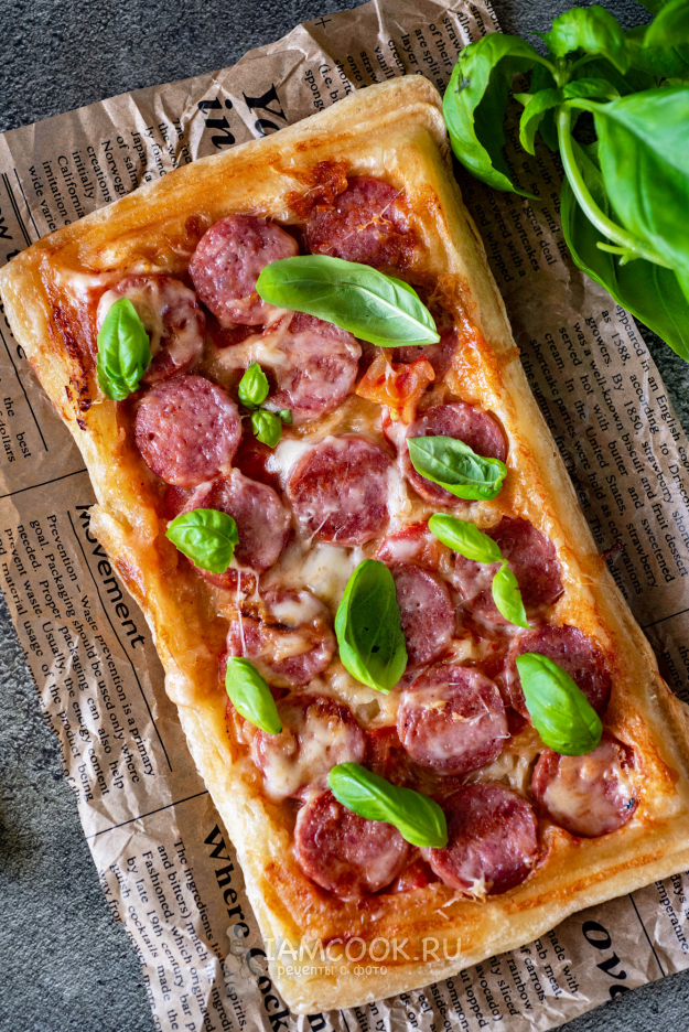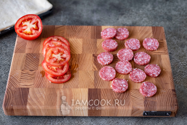 Соберите все необходимые ингредиенты для приготовления пиццы в мультипекаре. Заранее разморозьте слоеное тесто, если в этом есть необходимость. Помидор помойте, с колбасы снимите оболочку.