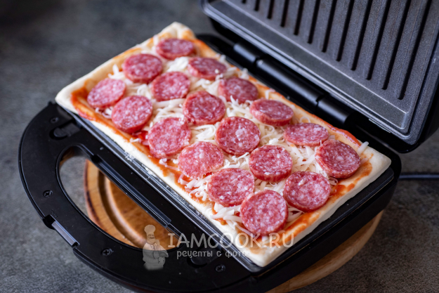 Включите разогреваться мультипекарь и панель с пиццей установите в мультипекарь. Накройте крышкой и выпекайте пиццу в мультипекаре 4-5 минут (или в соответствии с рекомендациями производителя вашего устройства).