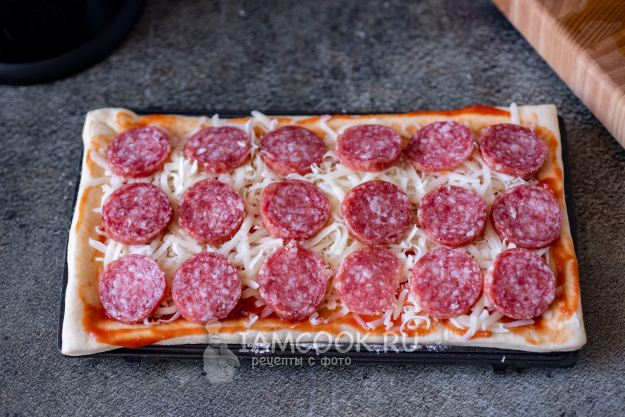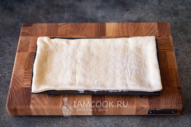 Пласт теста разрежьте на 2 прямоугольника, размер которых соответствует размеру сменной панели для мультипекаря "Гриль". Для приготовления одной пиццы нам потребуется только один прямоугольник, и вы можете вторую часть теста поместить в холодильник до следующего раза.