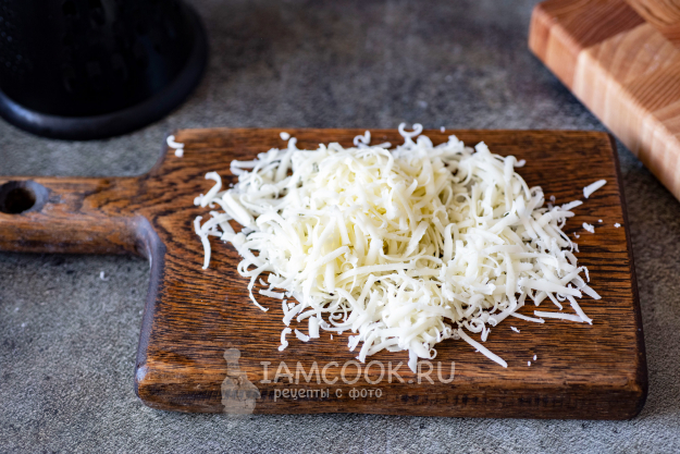 Поверх присыпьте слоем тертого сыра "Сулугуни".