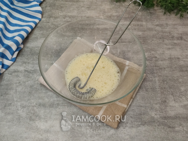 Чтобы баклажаны при жарке не впитывали много масла, их обычно солят обильно, дают постоять и отжимают. Я тоже так делаю. Но есть и другой способ, который позволяет, не нарушая текстуру и внешний вид кусочков баклажанов, добиться того же эффекта. В миску выбейте яйца, тщательно перемешайте.
