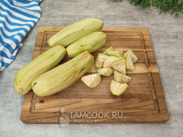 Баклажаны очищаем, режем не мелко, кубиками или ломтиками.