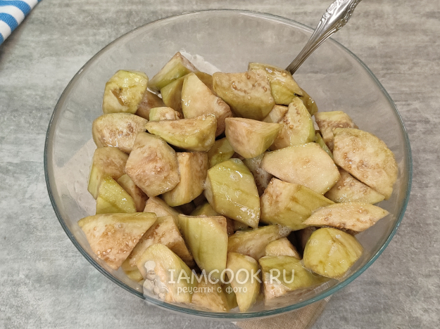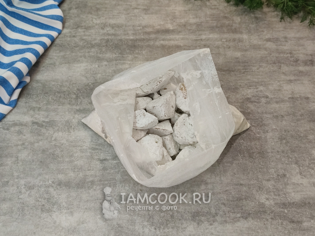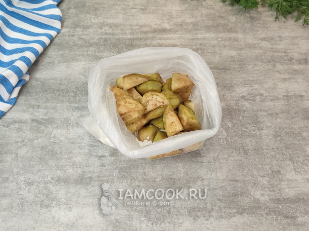 Пакет закрываю и хорошо встряхиваю. Баклажаны покрываются тонким слоем крахмала.
