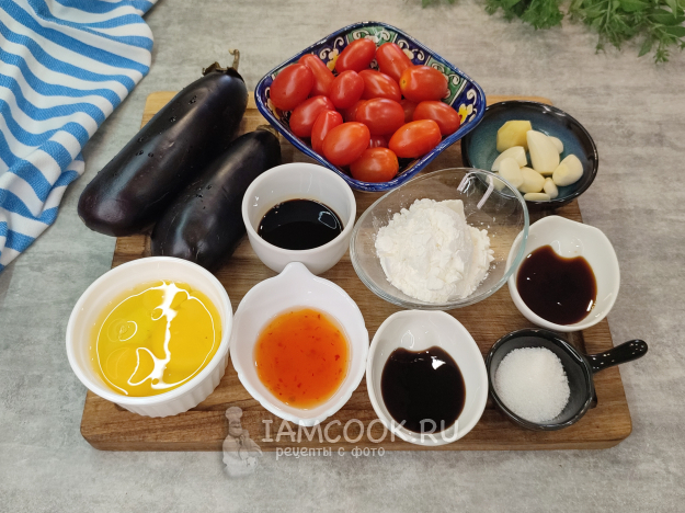 Соберите ингредиенты для приготовления баклажанов в сладком соусе с помидорами. Помидоры можно взять обычные, крупные, но если будет возможность, лучше используйте черри, они удобны и в нарезке, и в поедании, да и смотрится блюдо красивее. Используемые сегодня соусы абсолютно доступны, продаются во всех супермаркетах, настоятельно рекомендую добавить их все, ничего не пропуская.