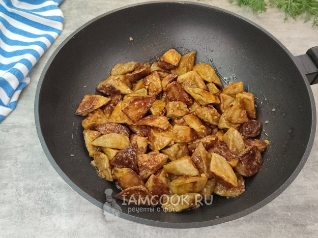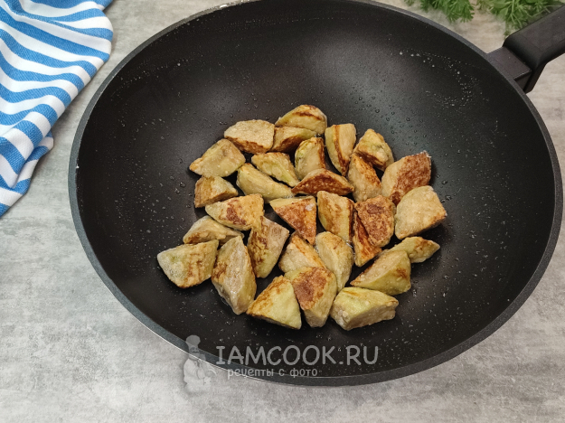 Стряхивая лишний крахмал, выкладываем кусочки баклажанов в разогретую с маслом сковороду, обжариваем на среднем (7 из 9) огне со всех сторон. Затем повторяем процесс с оставшимися баклажанами.