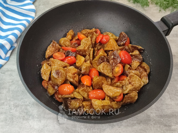 Помидоры долго готовить не надо, их добавляем в сковороду и просто прогреваем вместе с баклажанами еще минуту-другую.