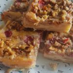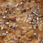 Через указанное время достаньте форму с пирогом. Залейте его приготовленной смесью, присыпьте орехами и отправьте в духовку еще на 15 минут.