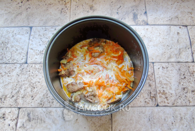 Сметану разведите в воде и этой смесью залейте печенку с овощами. Посолите и поперчите по вкусу.