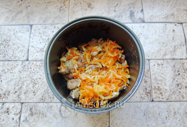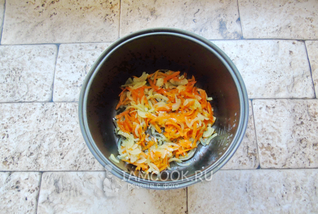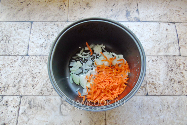 Морковь натрите на терке, а лук нарежьте произвольно. Выложите в чашу мультиварки и налейте 20 мл растительного масла.