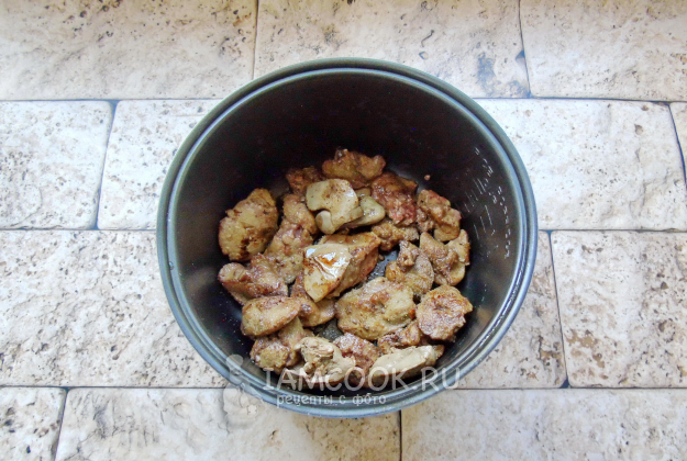 Куриную печень помойте, обрежьте жилки. Разрежьте на 2-3 части. Обваляйте в муке и выложите в чашу мультиварки. Налейте 20 мл растительного масла.