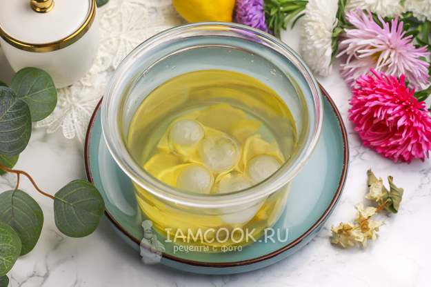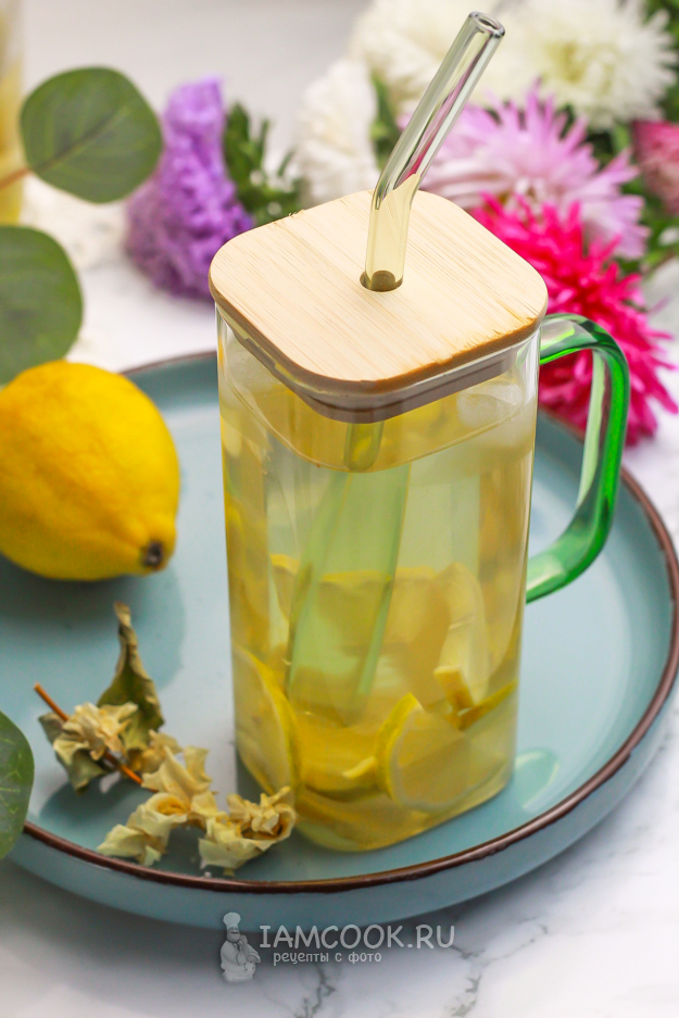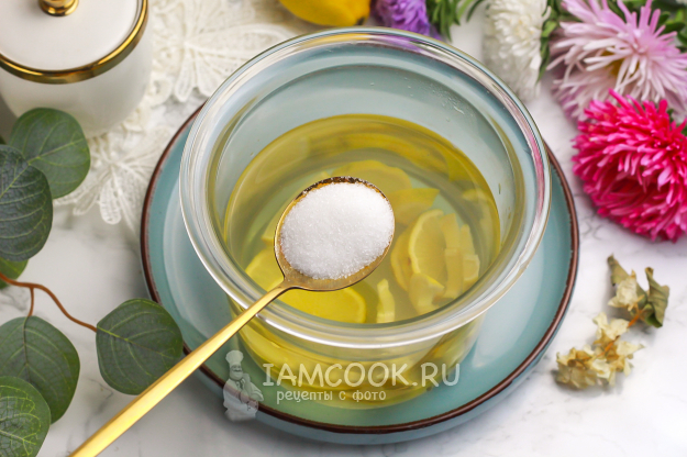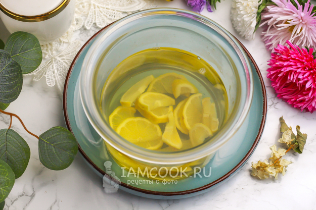Лимон ошпарьте кипятком, разрежьте пополам и удалите хвостики. Нарежьте каждую половину дольками, удаляя семена. Выложите в глубокую емкость и перелейте туда заваренную ароматную жидкость. Добавьте охлажденную кипяченую воду до того объема, который вам нужен.