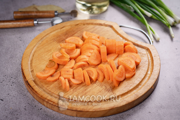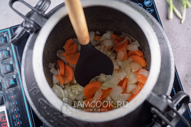 На дно афганского казана залейте растительное масло, выложите нарезанные морковь и лук. Обжаривайте эти овощи в казане 8-10 минут на среднем огне при открытой крышке.