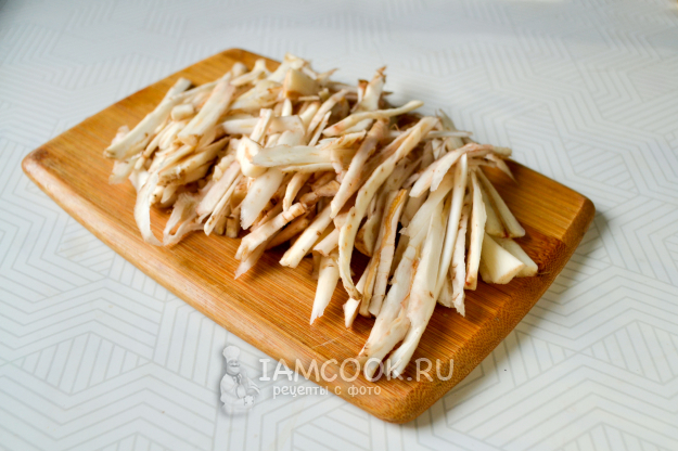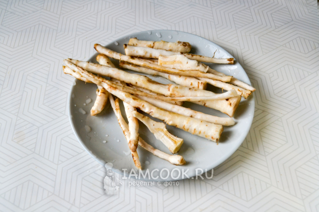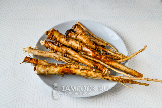 Очистите ножом корни от коричневой кожицы. Очищенные корни еще раз промойте в воде.