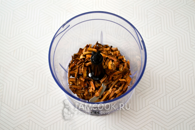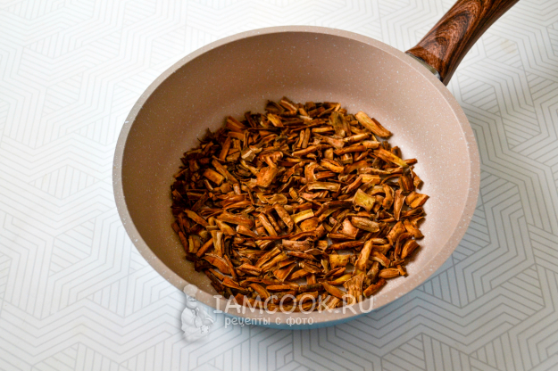 Подсушенный корень обжарьте, помешивая, на сухой сковороде на среднем огне до светло-коричневого цвета. Обжаренный корень охладите.