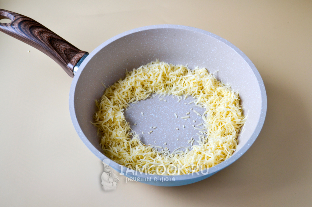На кунжут положите натертый на терке сыр. Влейте в центр сковороды растительное масло или положите кусочек сливочного.