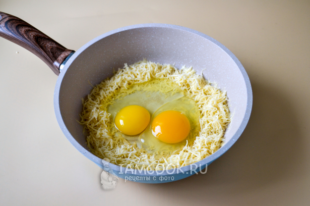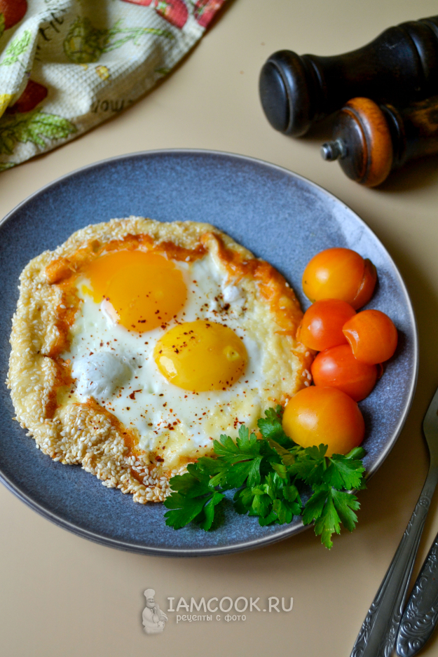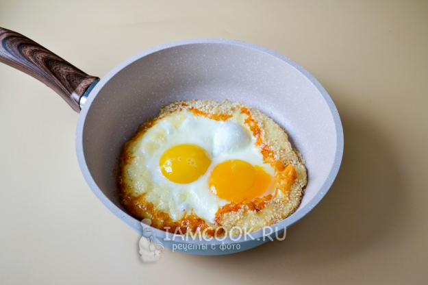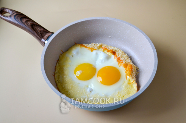 Готовьте яичницу обычным способом на среднем огне. Когда сыр начнет плавиться, подверните края яичницы (там, где кунжут с сыром) наверх.