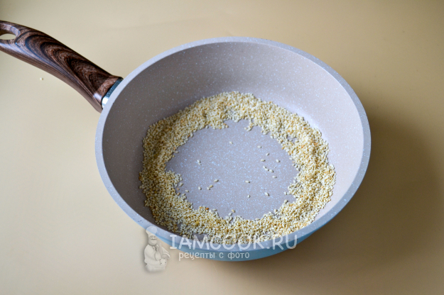 На сухую сковороду насыпьте кунжут и обжарьте до легкого золотистого цвета. Распределите кунжут по кругу сковороды, освободив место в центре.