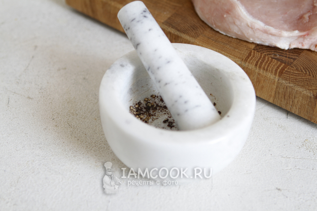 Щепотку крупной соли и несколько горошин черного перца измельчите в ступке.
