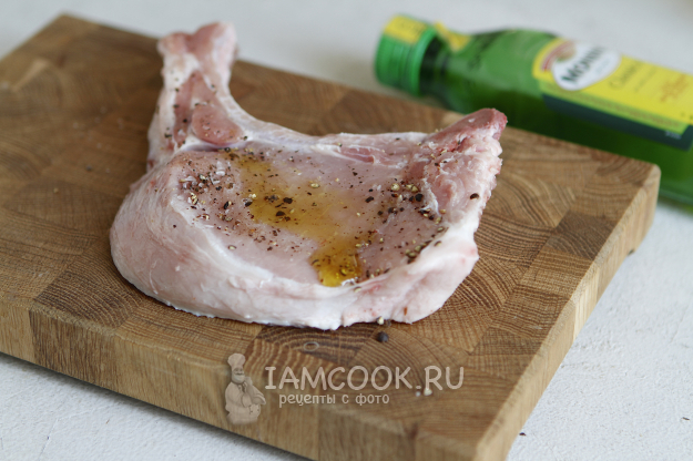 Сбрызните каждую сторону оливковым маслом. Переложите корейку в глубокую чашу, затяните ее пищевой пленкой и уберите в холодильник на 30 минут.