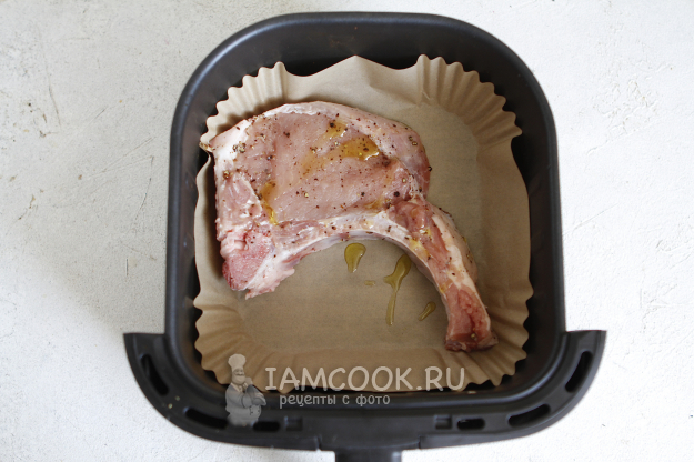 Чашу аэрогриля застелите пергаментом или специальным вкладышем. Выложите корейку.