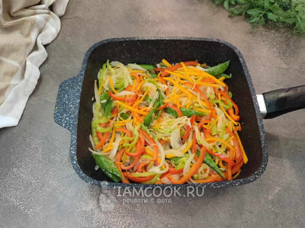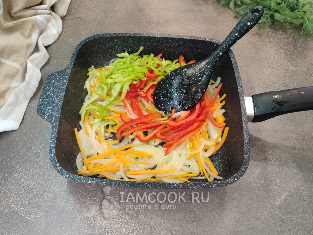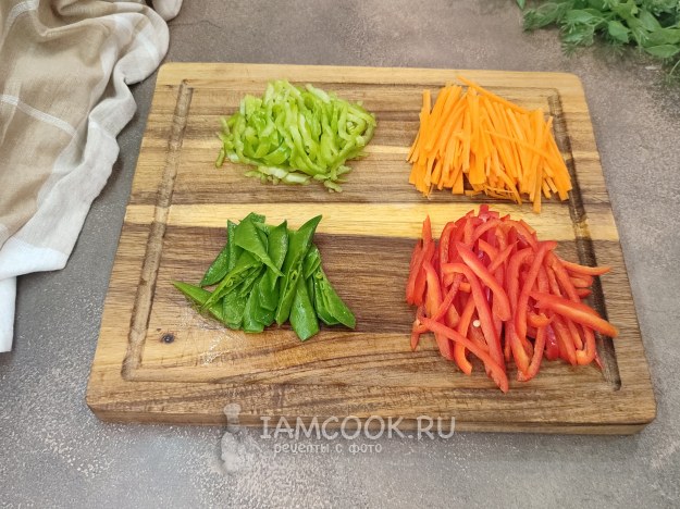 Добавьте морковь, жарьте еще минуту. Когда морковь станет мягче, добавьте перец. Зажаривать овощи до золотистой корочки у азиатов не принято, приветствуются овощи аль-денте, их просто нужно смягчить и прогреть.