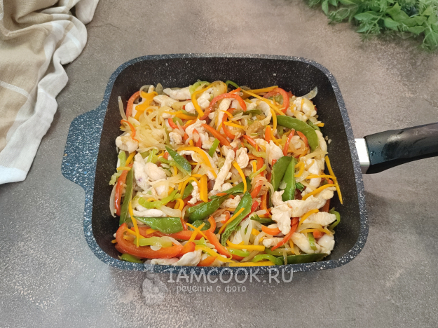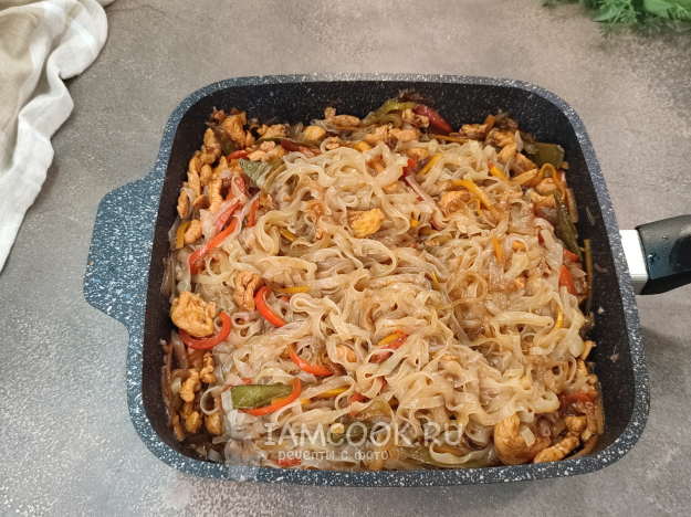 Перемешайте лапшу с мясом и овощами, прогрейте все вместе пару минут. Попробуйте, при необходимости добавьте соли.