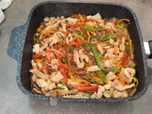 Перемешайте все вместе, чтобы соус равномерно распределился по мясу и овощам. Прогрейте все вместе минуты 2-3.