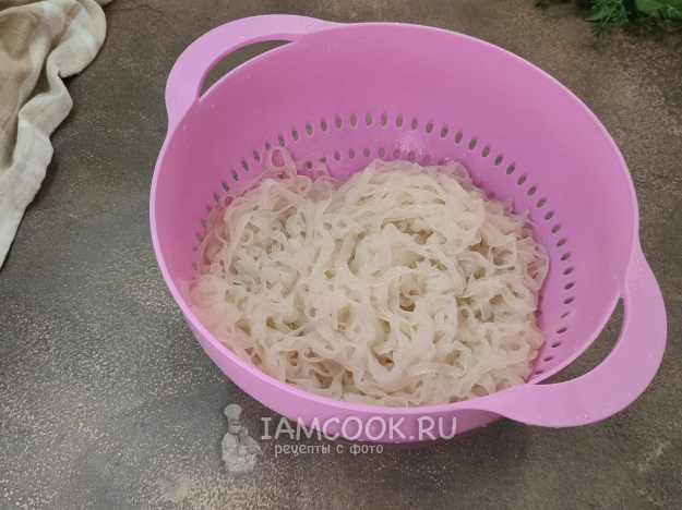 Лапшу отварите согласно инструкции на упаковке. Я отварила пару минут, откинула на дуршлаг и промыла холодной проточной водой.