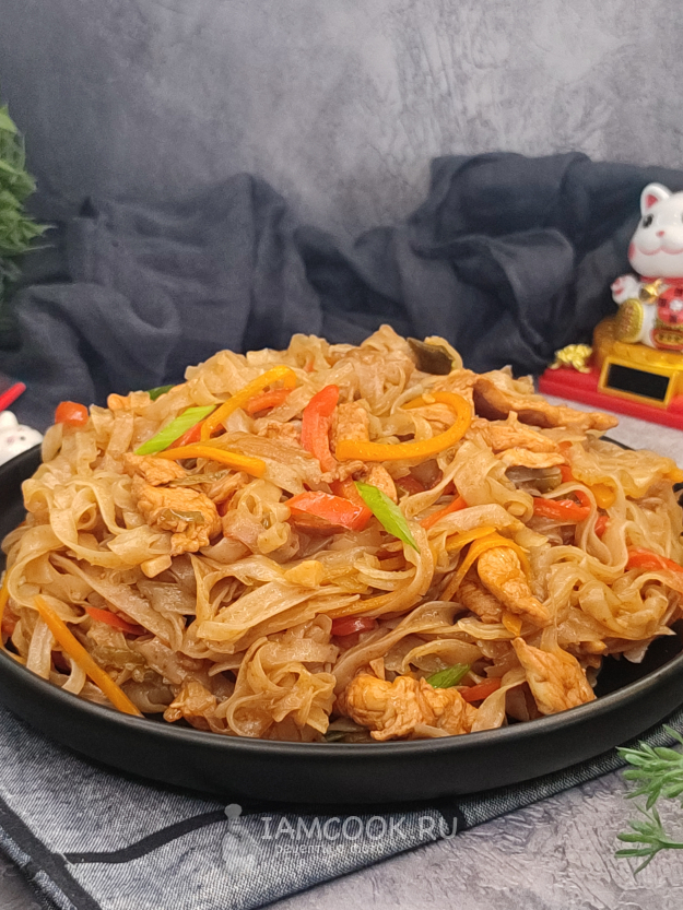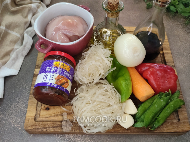 Соберите ингредиенты для приготовления лапши с курицей в соусе хойсин. Я взяла рисовую лапшу, но вкусно будет и с удоном, и с собой, и с бататной лапшой, например. Набор овощей на ваш выбор - чем они разнообразнее, тем вкуснее и полезнее получится блюдо.