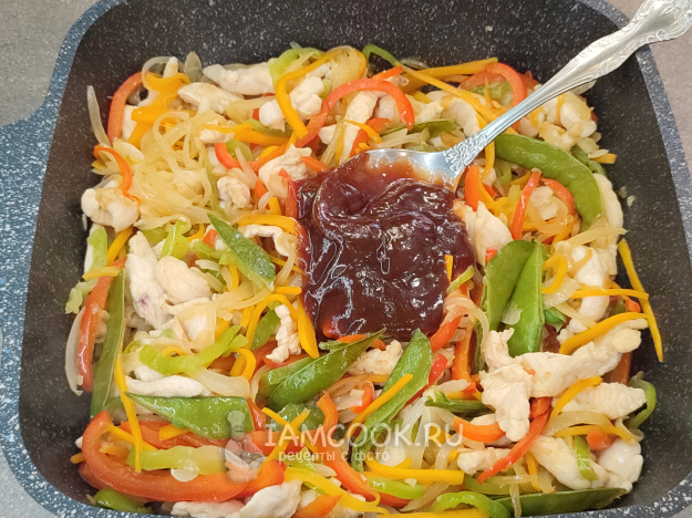 Влейте соевый соус, добавьте соус хойсин. Внешне он напоминает сливовый джем, а по вкусу... тоже напоминает, только соленый. Но слив там нет, есть много пряностей и специй). Соус достаточно сладкий, поэтому кладите по вкусу, в соответствии с вашей любовью к сладкому 😊, у меня были последние полторы ложки, все и добавила.