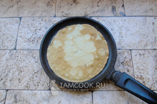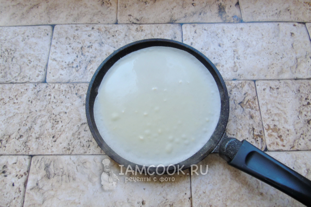 На горячую сковороду с толстым дном или антипригарным покрытием налейте половник теста, равномерно распределяя его по сковородке. Перед первым блином смажьте ее маслом.