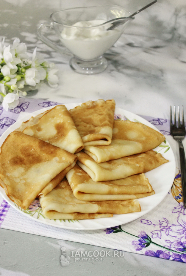Пеките блины с обеих сторон до золотистого цвета. Готовые блины складывайте стопкой на тарелке. При желании каждый горячий блин смажьте сливочным маслом.
