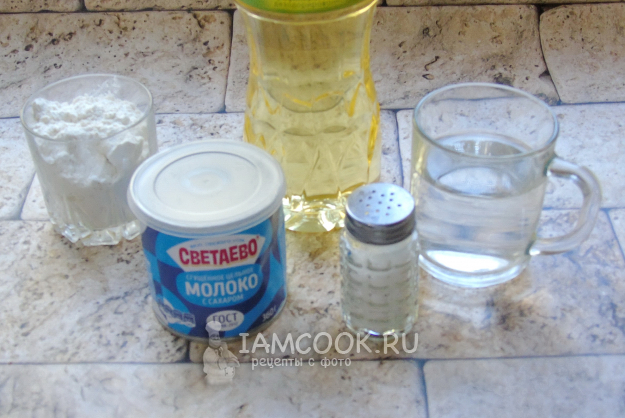 Соберите ингредиенты для приготовления блинов на сгущенке без яиц.