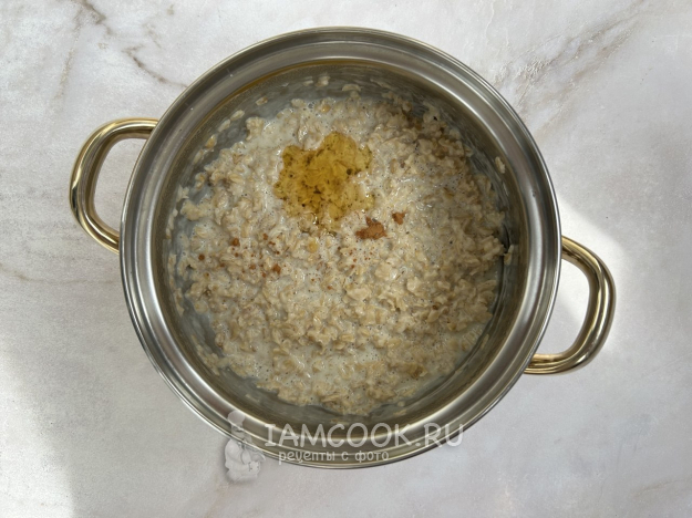 За минуту до готовности добавьте щепотку корицы и мед. Хорошо перемешайте.