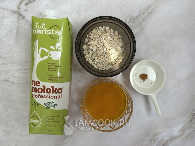 Соберите все необходимые ингредиенты для приготовления овсянки на соевом молоке по списку.