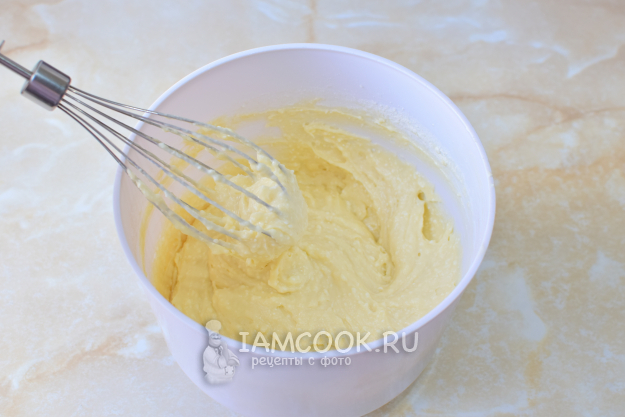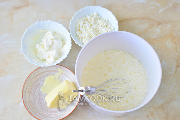 Вмешайте к яйцам сливочное масло, маскарпоне и творог.
