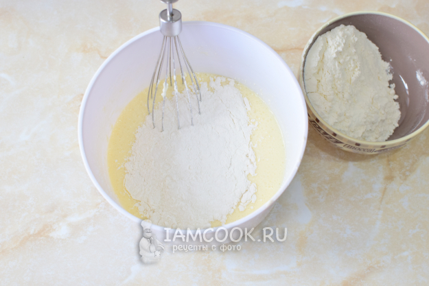 Добавьте ванилин и соду. Постепенно вмешивайте просеянную муку.