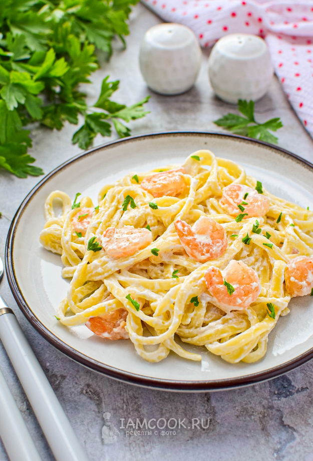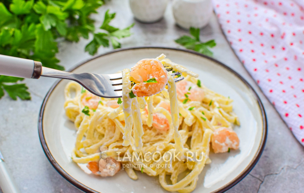 Пасту с креветками и маскарпоне разложите по тарелкам и подавайте к столу в горячем виде. Приятного аппетита!