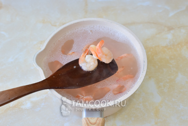 Замороженные креветки опустите в кипящую подсоленную воду. Доведите до кипения и проварите 1-2 минуты, чтобы они оттаяли. Затем откиньте их на дуршлаг, остудите и очистите.