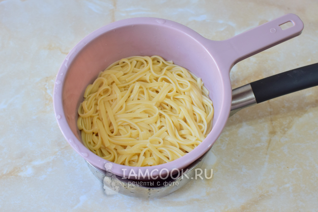 Затем откиньте на дуршлаг и пролейте холодной водой.