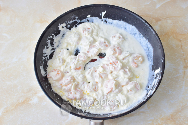 Добавьте в сковороду маскарпоне. Смешайте с креветками. При необходимости можно подлить немного горячей воды. По вкусу добавьте соль и специи.