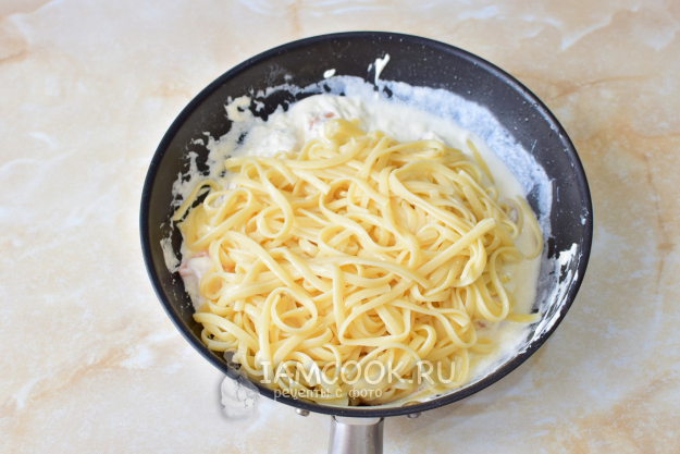 Отварите пасту. Для этого опустите её в кипящую подсоленную воду и варите до готовности, чтобы она стала мягкой.
