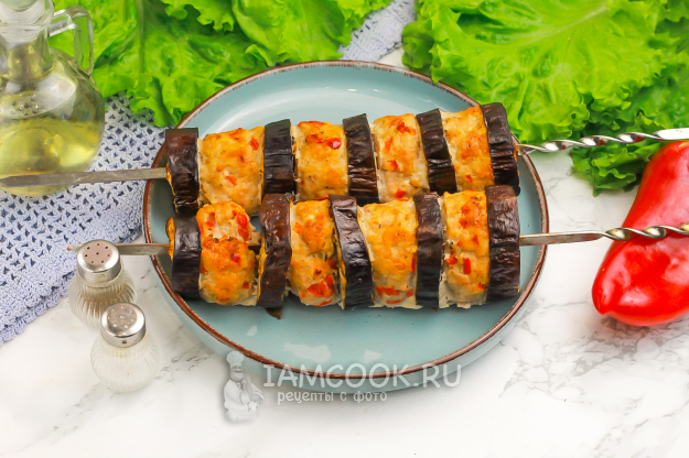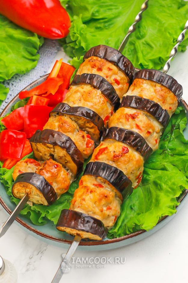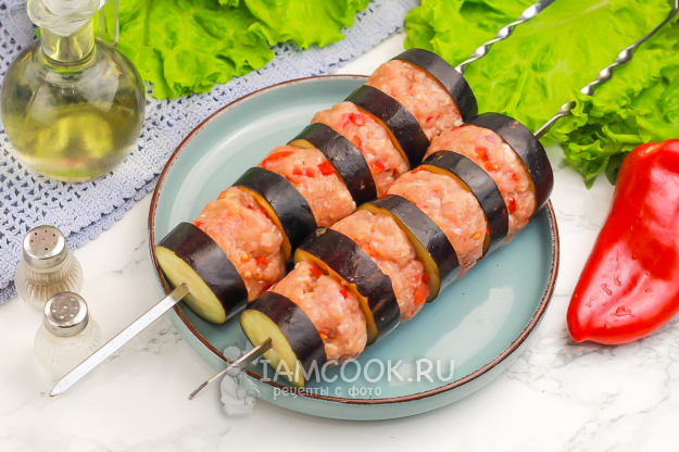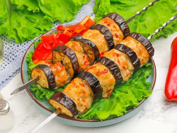 Запеките на мангале, на гриле или в духовке. На мангале - 15 минут, время от времени вращая шампур, в духовке при 180 градусах - 30-35 минут. Можно выложить в круглую форму поочередно баклажаны и колобки фарша, залить томатным пюре и запечь в духовке 50-60 минут - тоже выйдет очень вкусно!