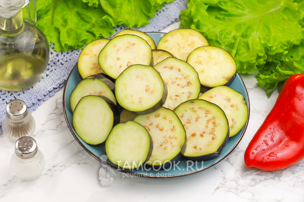 Промойте баклажаны, срежьте хвостики и нарежьте кружочками по 1,5 см толщиной.
