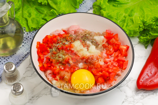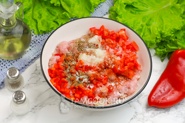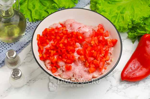 Выложите фарш в глубокую емкость. Промойте помидоры и сладкий болгарский перец. Вырежьте из помидоров зеленые сердцевинки, а из перца - семена. Еще раз промойте и нарежьте овощи мелкими кубиками, добавляя в емкость с фаршем.