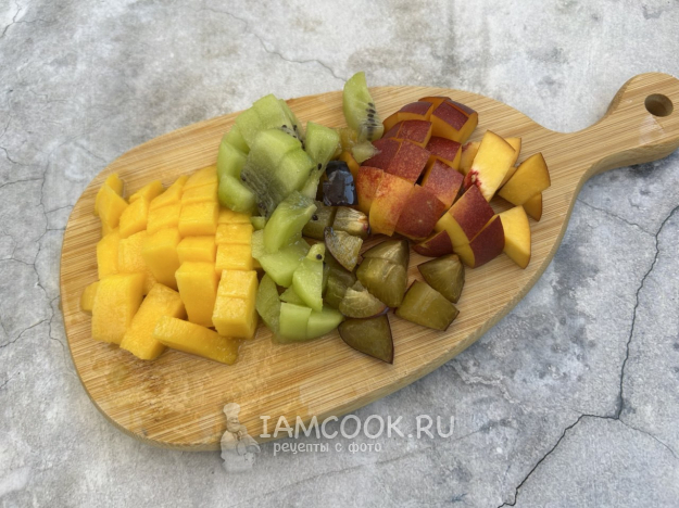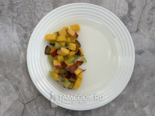 Готовые прозрачные блинчики из агар-агара аккуратно снимите с поверхности ножом или лопаточкой и переложите на тарелку. На одну половину блинчика выложите нарезанные фрукты, сверху накройте второй половиной блинчика. Всё то же самое проделайте с остальными блинчиками.