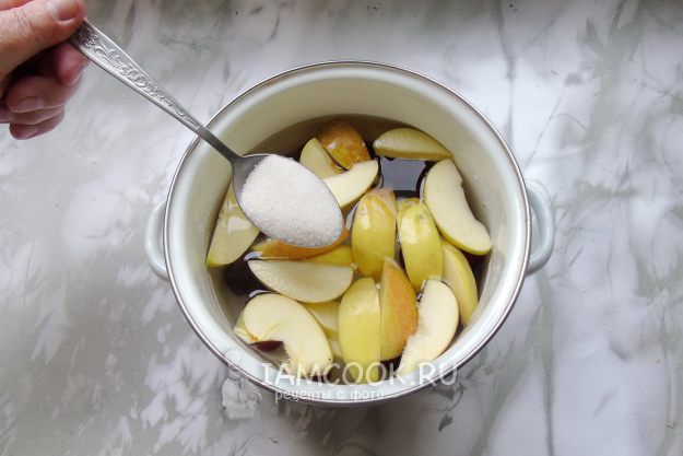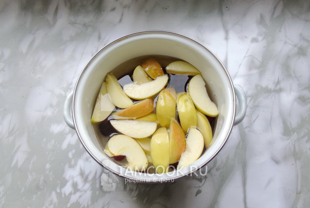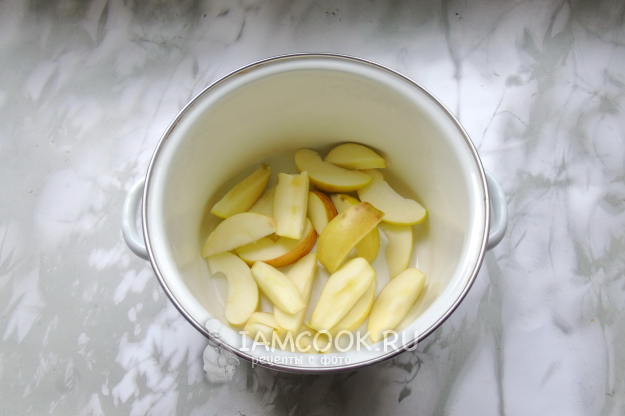 Яблоки помойте, удалите сердцевину и нарежьте дольками. Выложите в кастрюлю.