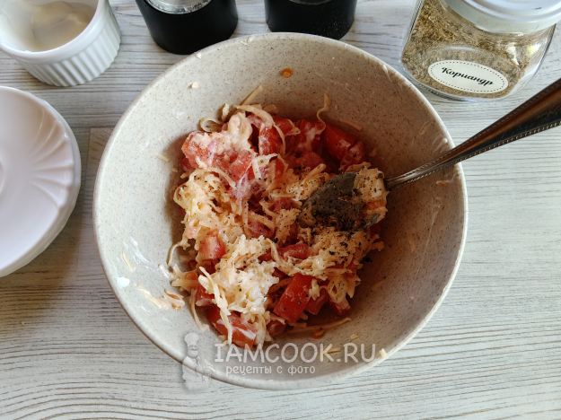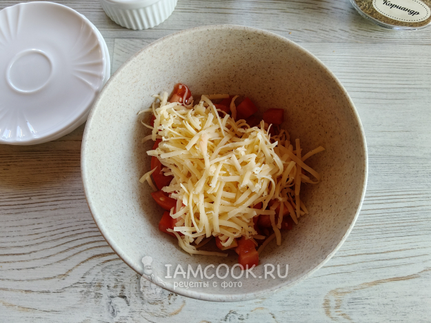 Помидор нарезать мелким кубиком, сыр натереть на терке.