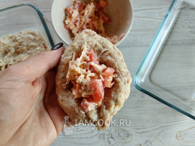 Запекать котлеты с начинкой в духовке 25 минут при температуре 180 градусов.