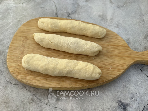 Присыпьте поверхность мукой и разделите тесто на равные кусочки. Из них скатайте колбаски длиной примерно 12-13 см.